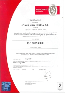 En el año 2004 JOSMA MAQUINARIA, S.L. consiguió la certificación ISO 9001:2000 abarcando los procesos de fabricación y distribución de maquinaria para marroquinería y calzado.